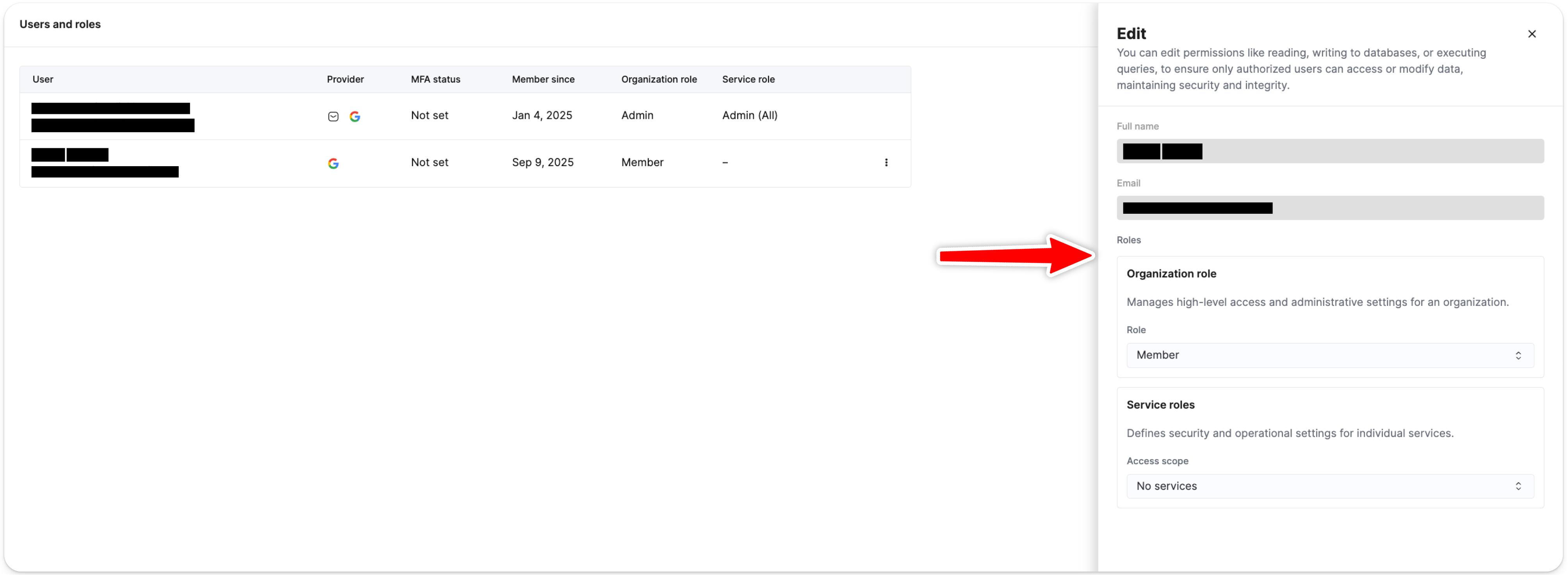 선택된 사용자의 서비스 역할(service role)의 액세스 범위를 조정하려면 드롭다운 메뉴에서 항목을 선택합니다. Specific services를 선택하면 서비스별로 사용자의 역할을 제어할 수 있습니다.